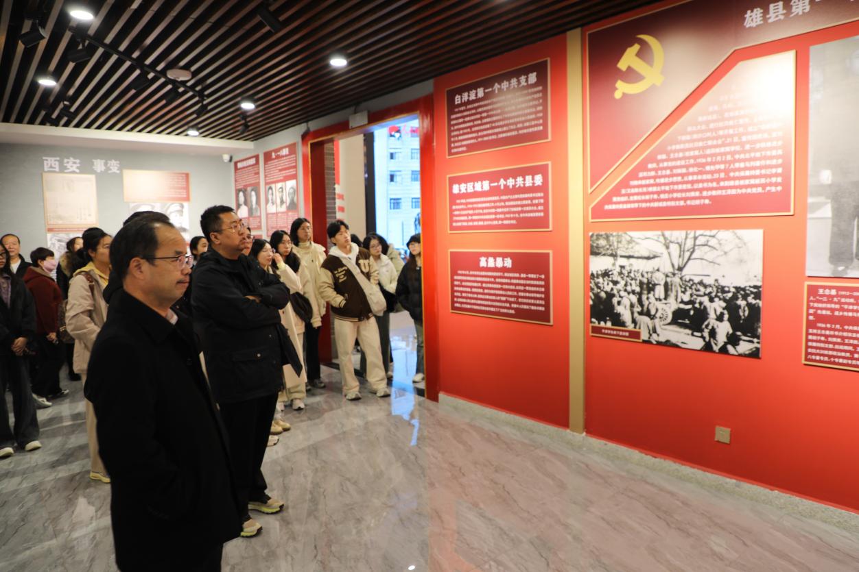 最后一站,师生们走进黄湾村红色展览馆与雄安都市农业科技博览园。在红色展览馆内,讲解员带领师生们重温了革命先辈奋斗历程,接受了深刻的爱国主义和革命传统红色教育。在雄安都市农业科技博览园,师生们实地考察了园区建设及运营情况,详细了解黄湾村在党建引领下,依托科技赋能现代都市农业、充分利用红色资源发展特色文旅产业,推动乡村振兴事业的经验做法。