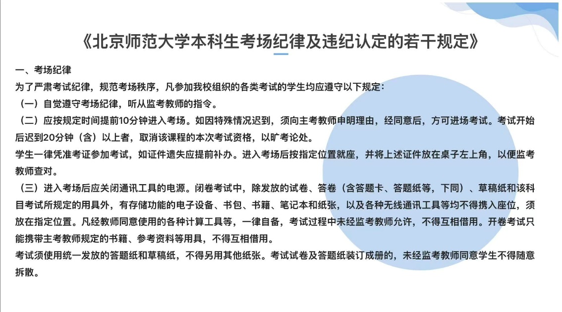 临近期中考试,班会特别设置规则学习环节。主持人首先引导同学们探讨学业失信可能带来的“三重失去”——知识的缺失、机遇的错失、信誉的丧失。随后,班会开始严肃而必要的规章制度学习。全体同学共同研读了《国家教育考试违规处理办法》《北京师范大学考场规则》及《北京师范大学本科生考场纪律与违纪认定的若干规定》等关键文件。通过对条款的细致解读,大家进一步明确了学术规范的红线与行为规范的底线,强化了规则意识。