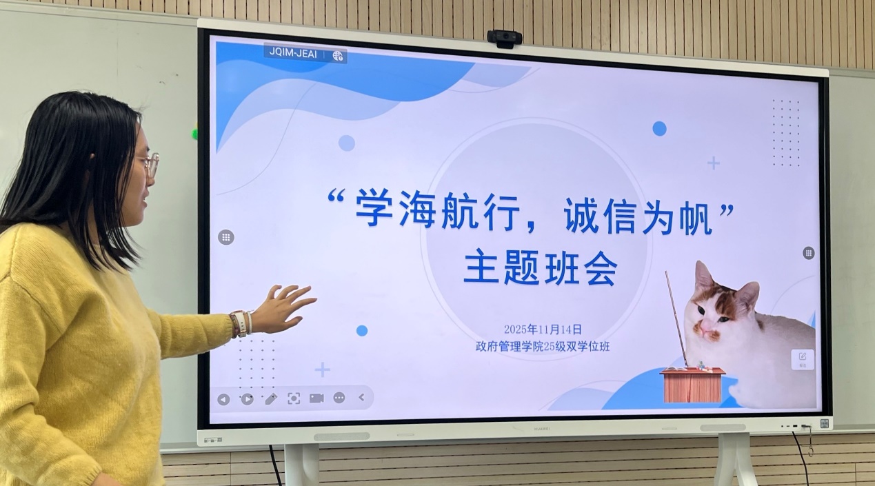 在知识经济蓬勃发展与多元文化交融并蓄的时代背景下,筑牢思想根基、恪守学术诚信,不仅是当代大学生立身处世的品德基石,更是推动学术创新与社会进步的重要保障。为积极响应学校关于加强思想政治与学风建设的号召,2025年11月14日下午,北京师范大学政府管理学院2025级“公共事业管理+人工智能”双学位班于后主楼2030会议室成功举办以“学海航行,诚信为帆”为题的道德诚信教育主题班会。班会由班长邱施颖主持,除一名同学请假外,全员齐聚,共话诚信。