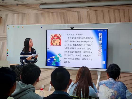 班会最后,班主任陈泳潼老师发表了语重心长的讲话,对同学们提出了殷切期望。她再次强调学术诚信的重要性,提醒同学们要认真阅读学校对于考试纪律的相关规定,避免因一时疏忽造成严重后果。她高度评价本次班会的系列成果,给予了同学们真诚的祝福,祝愿同学们学习顺利,生活愉快。