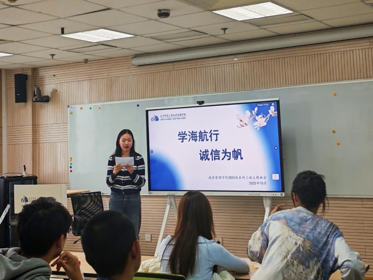 为进一步引导班级同学树立诚信意识,营造崇信笃行的学风,让学术诚信内化为每个人的精神追求与自觉行动,经班委会研究,10月22日下午,政府管理学院2025级本科3班于后主楼2030会议室举办“学海航行,诚信为帆”十月主题班会。本次班会由学习委员彭梦露主持,班主任陈泳潼老师出席,班级全体同学参加。