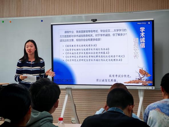 随后,学习委员带领同学们详细分析了作弊的可能动机和可能心理因素,让同学们深刻认识到作弊行为的来源;深度剖析了作弊对于心理健康和未来发展不可估量的危害。“作弊无法让能力得到实质性提升,既不利于当下,更会对未来产生负面影响。”她详细介绍了北京师范大学关于学术诚信规定,如《北京师范大学研究生考场纪律及违纪认定的若干规定》等文件内容,让同学们清晰认识到各种违纪行为界定,以及相应的处罚措施。