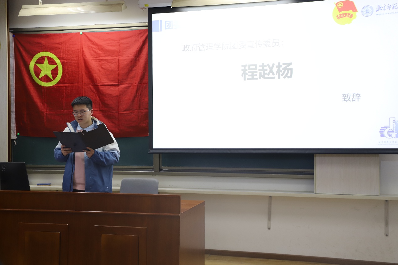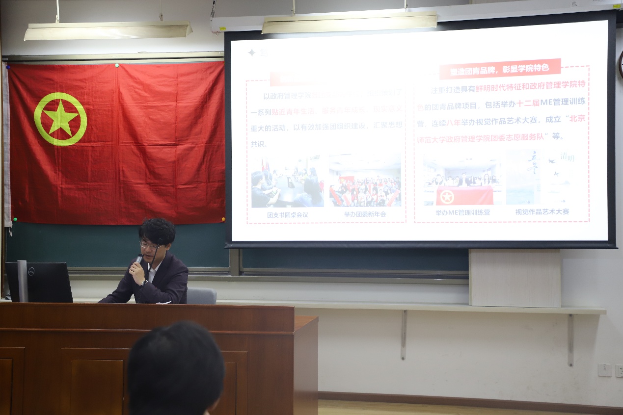 陈浩强老师向所有团员开展“青春逢盛世,奋进正当时——深学笃行党的二十届四中全会精神”主题团课。首先,团委书记陈浩强老师带领团员们深入把握了中国共产党的二十届四中全会的重要特征与时代意义,共同学习了党的历届四中全会历史,解码中国式现代化的“十五五”行动纲领,呼吁大家坚持党的重要原则,勇担时代光荣使命。接着,陈老师分别从笃行、笃实、笃学、笃察四个方面来介绍了北京师范大学政府管理学院团委的发展,并且展示政府管理学院团委的特色工作——深耕厚植暑期社会实践活动,鼓励大家踊跃参加。最后,陈老师衷心希望与大家在未来一起继续努力,为政府管理学院团委工作奉献自己的力量。