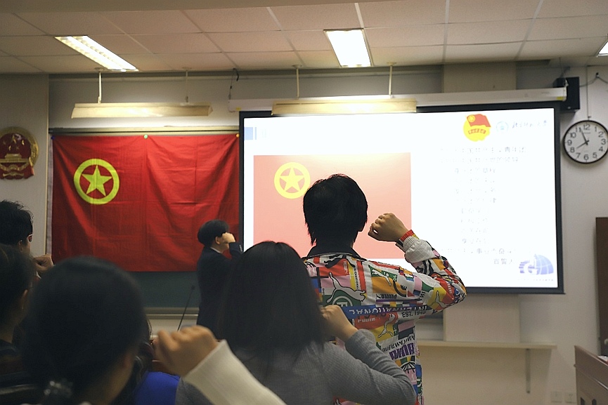 紧接着,全体团员肃立,右手握拳,共同重温入团誓言,在庄重的宣誓声中更加坚定向党组织靠拢的决心。