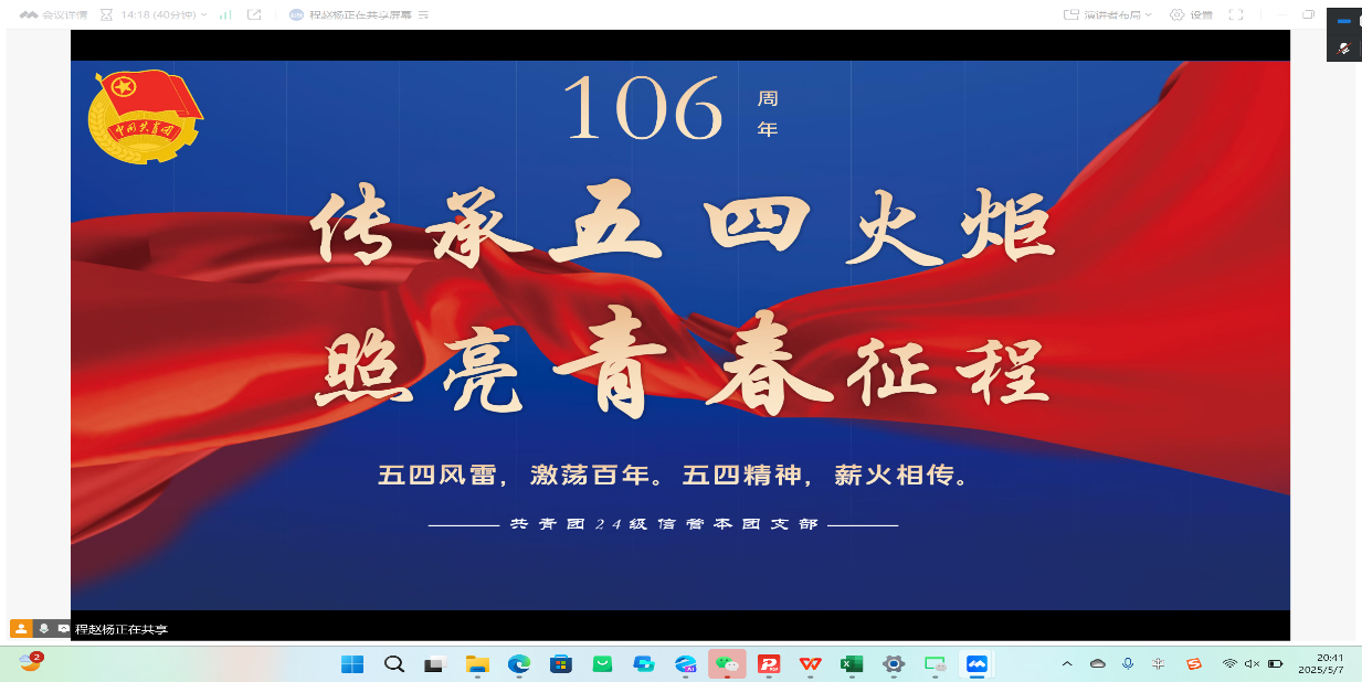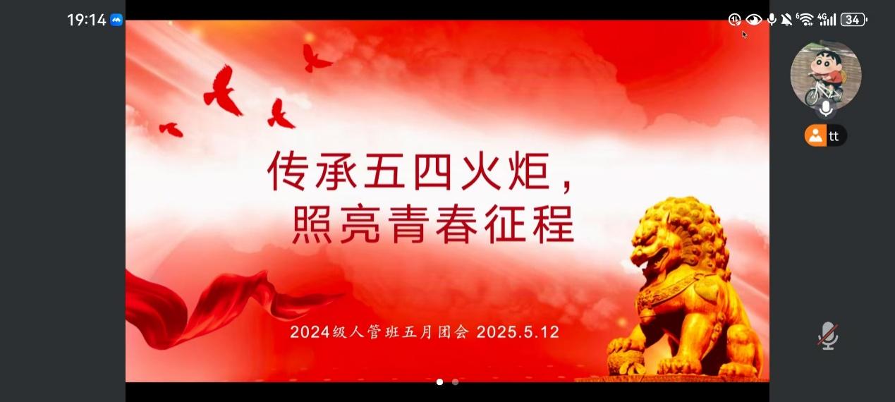 2025年5月19日20:30,21人管本团支部、22公管本团支部、22人管本团支部联合举办了“传承五四火炬,照亮青春征程”主题团日活动。会议由21人管本团支部书记马帅主持,各支部全体团员参加。