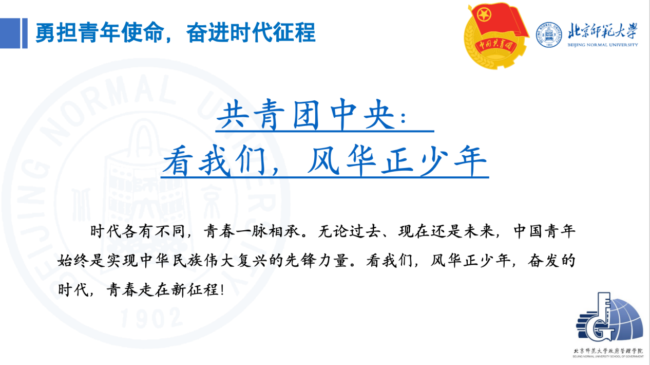 为传承五四精神,激发青年学子的责任与担当,北京师范大学政府管理学院2023级博士2班团支部于5月23日开展“传承五四火炬,照亮青春征程”主题线上团日活动。本次活动通过理论学习、交流研讨的形式,引导博士班学子深刻领悟五四精神的时代内涵,在新时代征程中贡献青春力量。