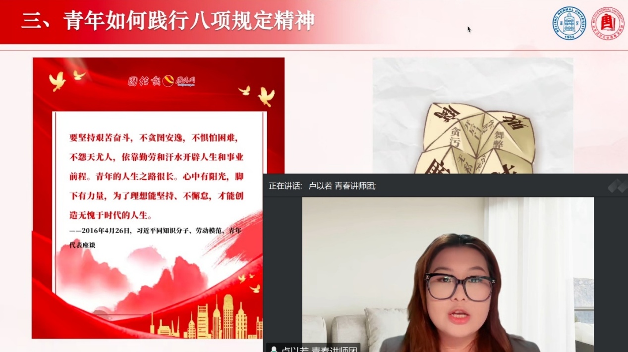 宣讲结束后,团支书郑柯欣对本次活动进行了总结。最后,全体同学进行了线上合影,为本次主题团日活动画上了圆满的句号。本次主题团日活动的成功开展,不仅加深了同学们对中央八项规定精神的理解,更激发了大家传承五四精神、担当时代责任的热情。