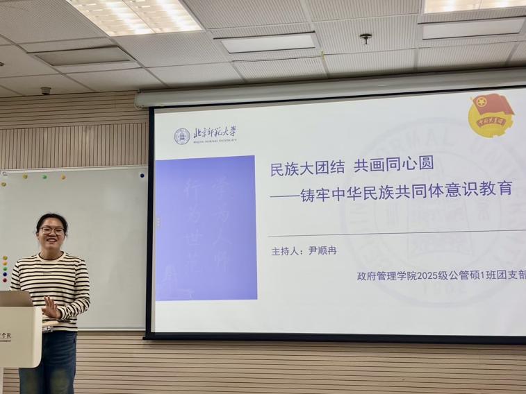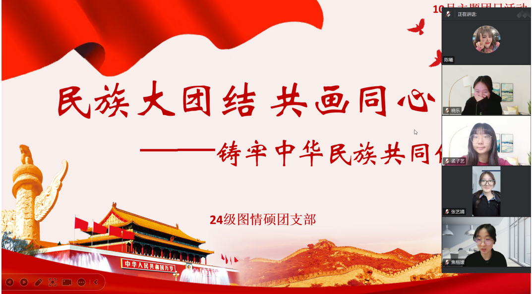 为深入学习贯彻习近平总书记关于加强和改进民族工作的重要思想,引导广大团员青年深刻认识铸牢中华民族共同体意识的重大意义,10月24日晚21:00,北京师范大学政府管理学院2025级图情硕士班线上举行了主题为“民族大团结,共画同心圆——筑牢中华民族共同体教育”的团日活动,全体团员积极参与。