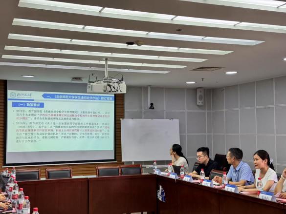 接着,学校党委学生工作部管理处丁凌老师围绕2025版《北京师范大学学生违纪处分办法》的修订背景、修订意义、修订概况及修订内容进行解读与说明,结合办法细节及学生日常管理实际案例对班主任老师们开展培训,并提醒新版的违纪处分办法将于今年9月开始实施。