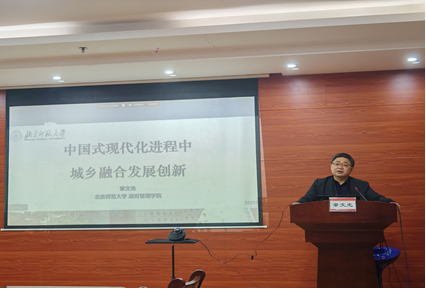 签约仪式结束后,章文光院长依托教育部“精准扶贫与乡村振兴课程群”虚拟教研室平台,为南宁师范大学师生作了题为“中国式现代化进程中城乡融合发展创新”的专题讲座。在互动环节,他悉心解答同学们的问题,并鼓励大家立足区域实际,将专业知识融入地方治理需求,积极投身数字政府与智慧城市管理等新兴领域,锤炼本领、提升素养。现场交流气氛热烈,同学们纷纷表示,讲座兼具理论高度与实践温度,为未来的学术方向与职业发展提供了有益指导。
