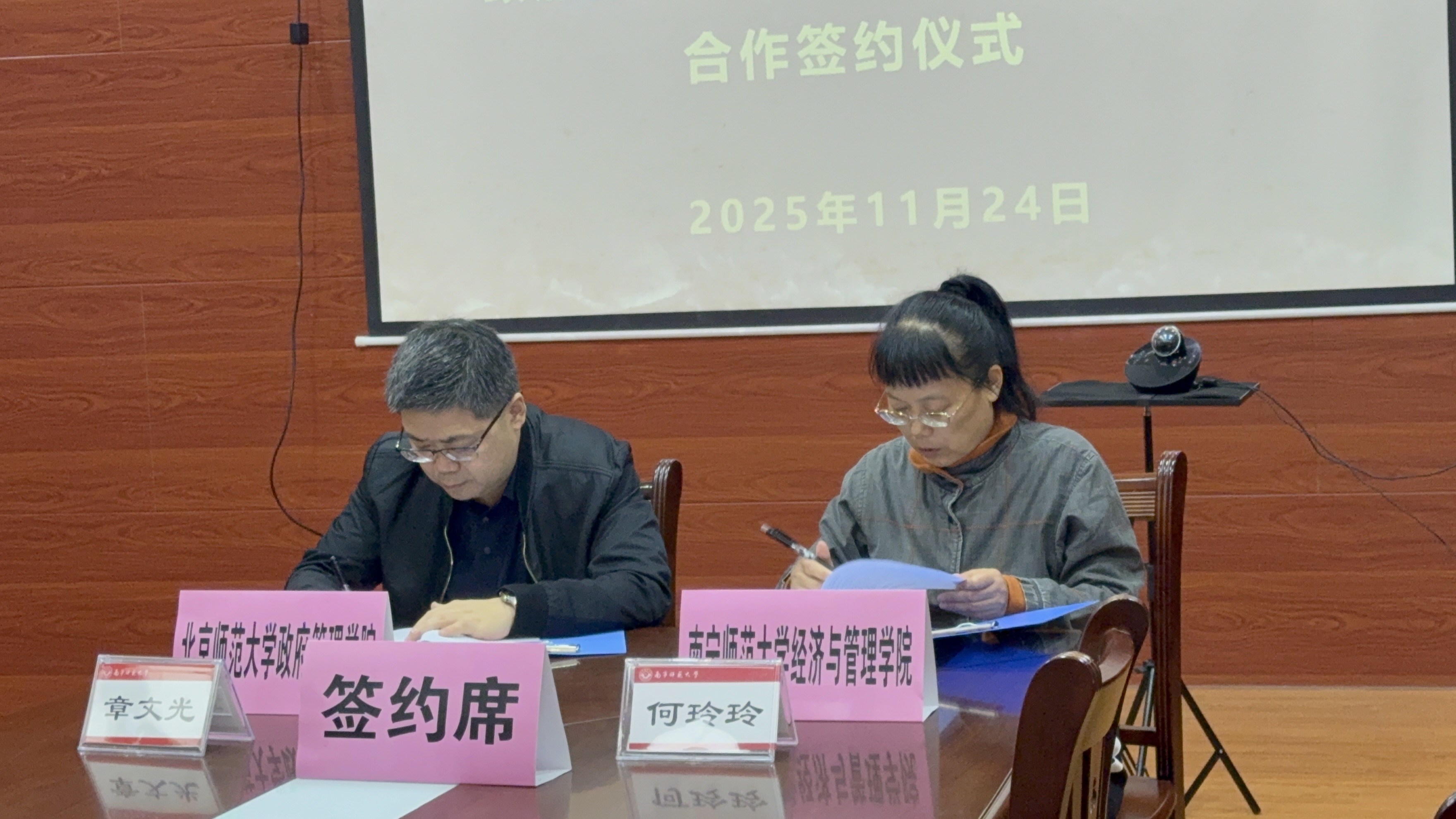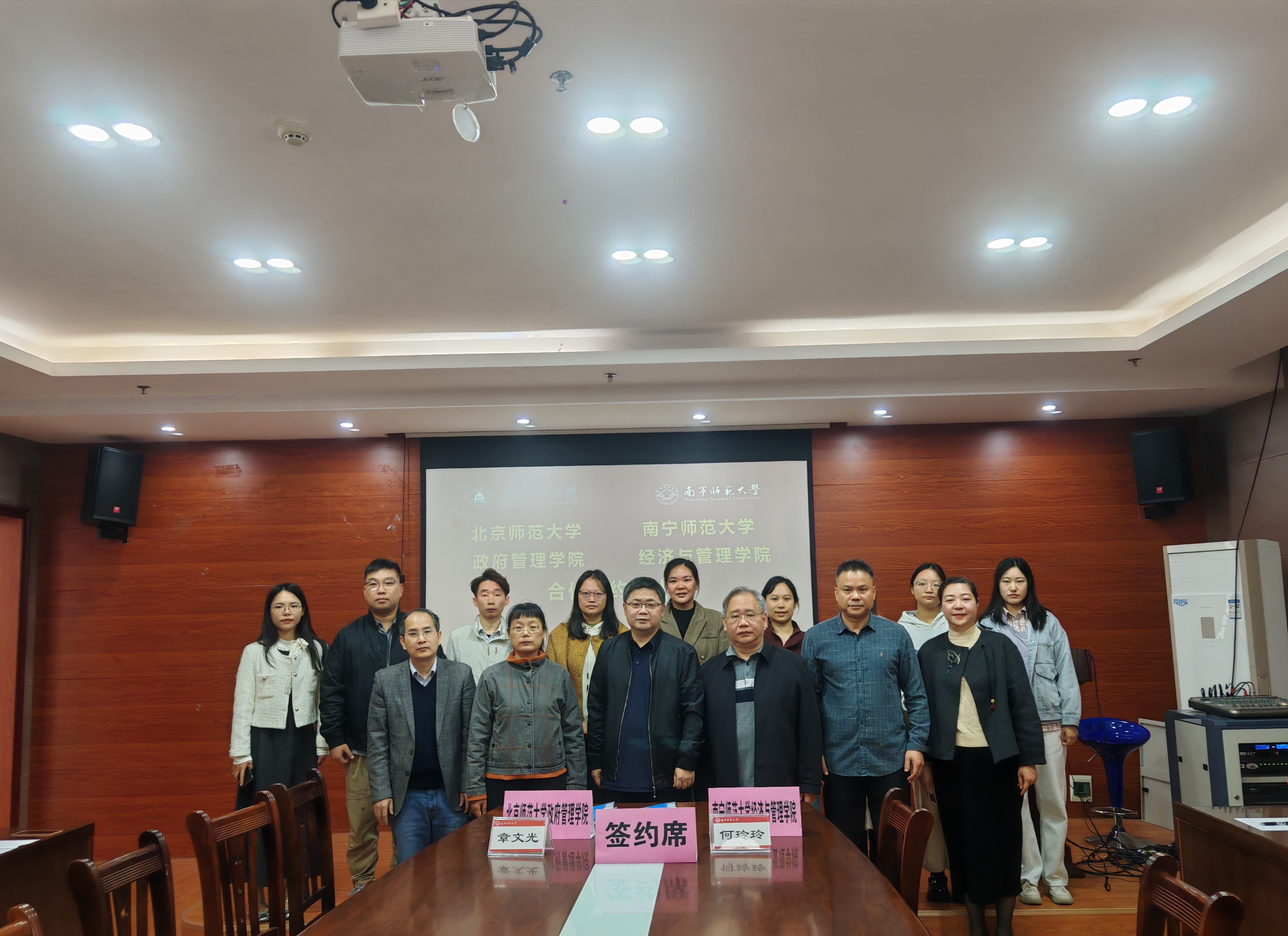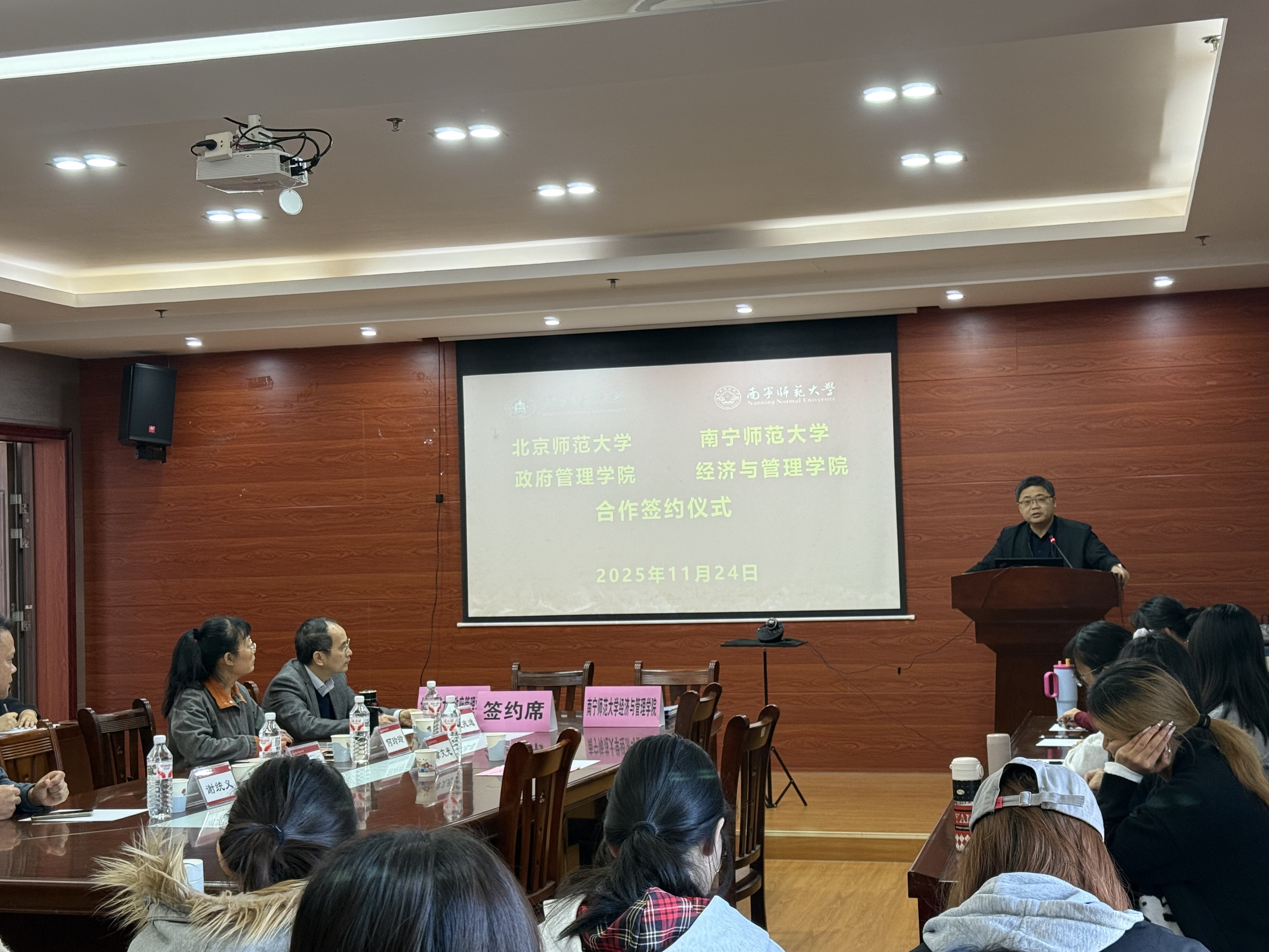 2025年11月24日,北京师范大学政府管理学院与南宁师范大学经济与管理学院合作签约仪式在南宁师范大学五合校区理楼515会议室举行。仪式由南宁师范大学经济与管理学院党委书记韦海鸣教授主持,北京师范大学政府管理学院院长章文光教授、南宁师范大学经济与管理学院院长何玲玲教授及学院领导班子成员、师生代表共同出席签约仪式。